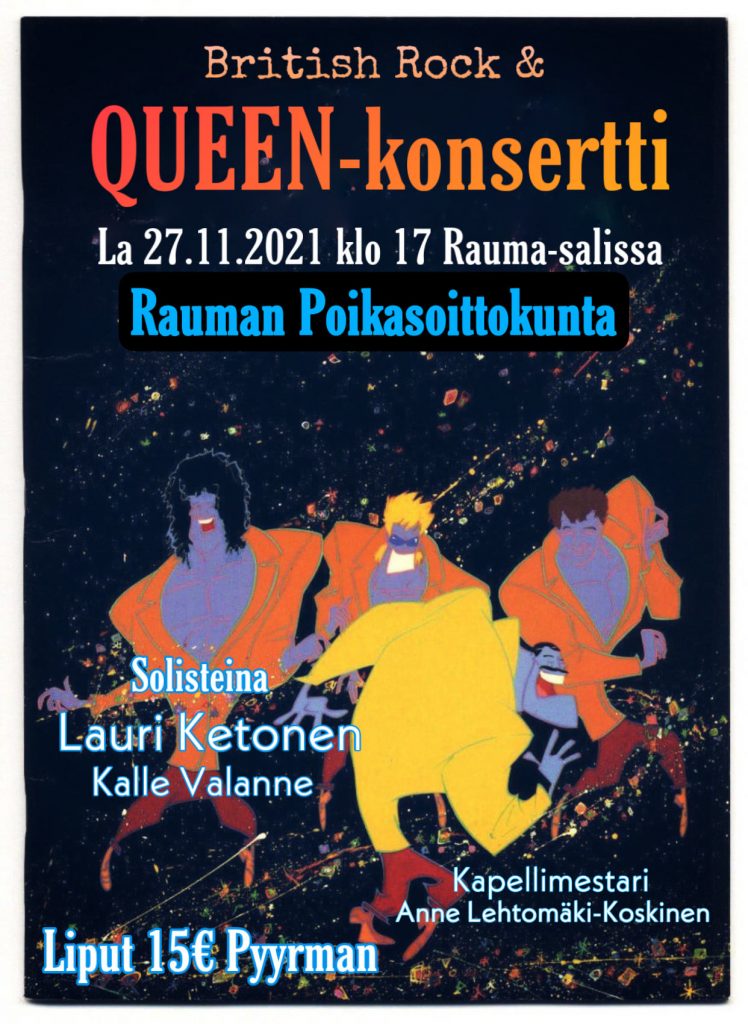 Rauman poikasoittokunnan British Rock & Queen-konsertti Rauman poikasoittokunnan Queen-konsertti Rauma-salissa 27.11.2021 klo 17. Solisteina Lauri Ketonen ja Kalle Valanne Kapellimestari Anne Lehtomäki-Koskinen. Ennakkoliput Palvelupiste Pyyrman, Valtakatu 2 A, p. 02-834 5000, palvelupiste@rauma.fi Rauma-sali, Satamakatu 26, Rauma https://ls24.fi/uutiset/soittokunnat-palasivat-arkeen-yleisolle-sen-sijaan-tarjoillaan-marraskuussa-musiikin-juhlaa
